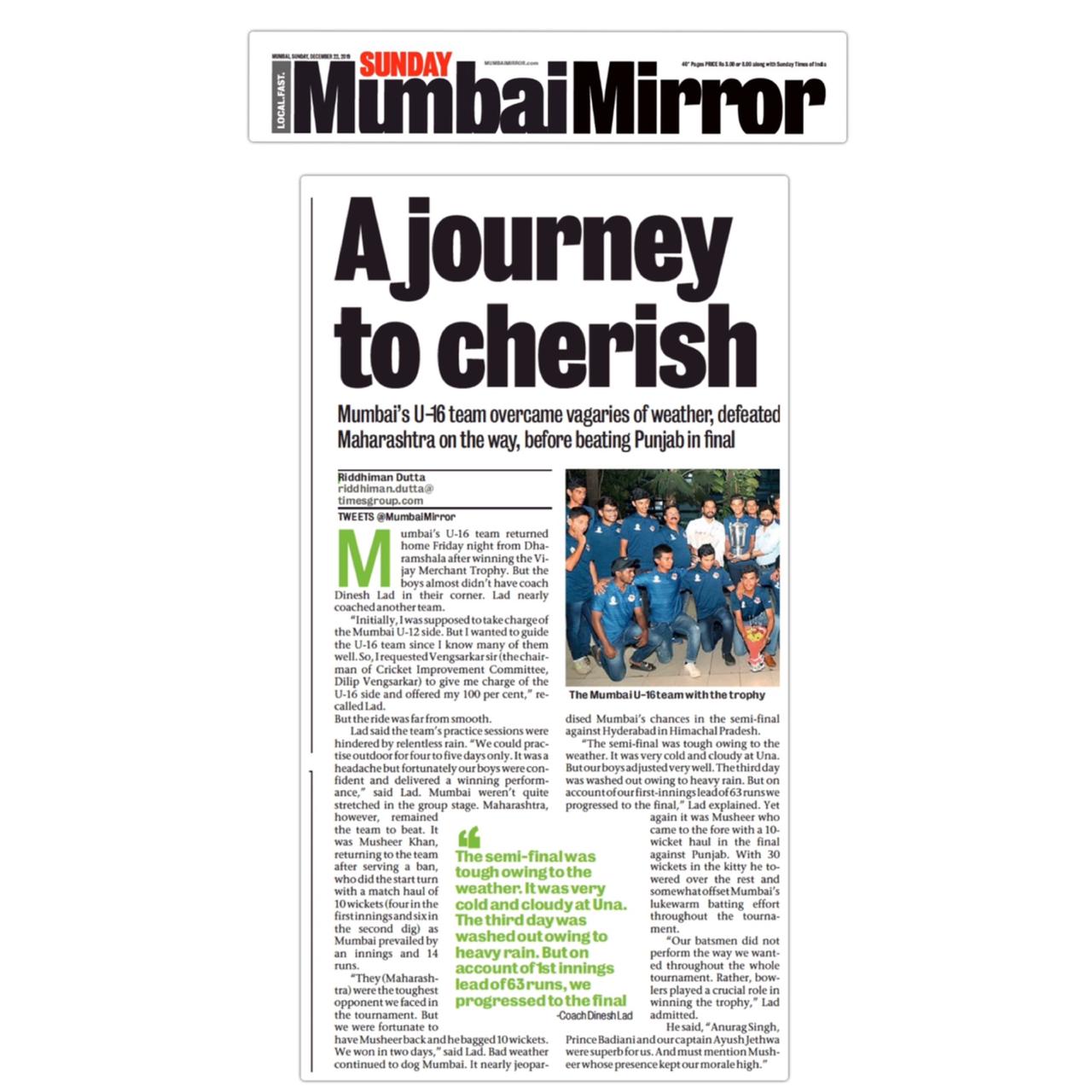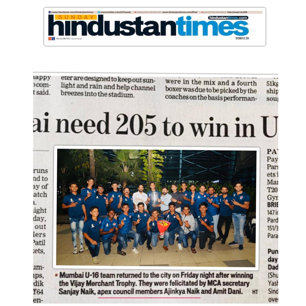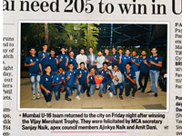Mumabai U-16 team returned to the city on Friday night after winning the Vijay Merchant Trophy. They were felicitated by MCA secretary Sanjay Naik, apex council members Ajinkya Naik and Amit Dani.