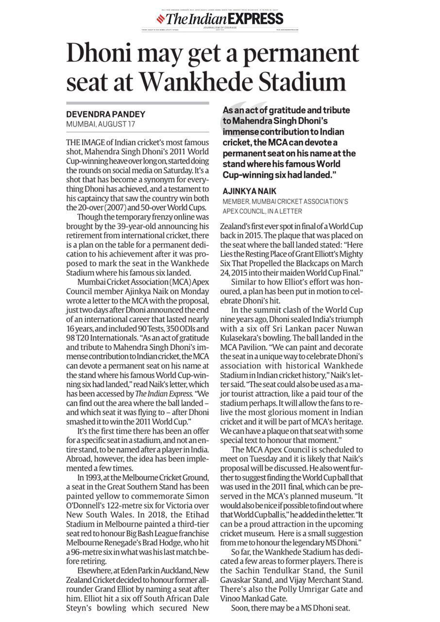 Wankhede Stadium seat where MS Dhoni's 2011 WC final six landed, proposed to be named after him